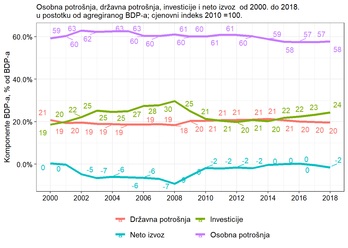 Dok su osobna i državna potrošnja, kao omjer BDP-a, relativno stabilni u cijelom razdoblju, investicije pokazuju značajnu volatilnost. Od 2000. do 2008. godine su investicije rasle s 18% na čak 30% BDP-a, a u samo jednoj godini pale su na 24 % BDP-a. Pad je nastavljen i nakon Velike recesije, pa su se 2014. godine investicije vratile na razine BDP-a na kojima su bile 2000. godine. Nakon 2014. investicije se počinju oporavljati, ali su razine investicija još uvijek znatno niže od pretkriznih razina. Upravo tu se vidi visoka volatilnost domaćih investicija. Zanimljivo je da neto izvoz i ukupne investicije izgledaju kao zrcalne funkcije u odnosu prema horizontalnoj osi. To daje naslutiti da je rast domaćih investicija bio financiran priljevom inozemnog viška štednje. To također potvrđuju i podaci HNBa, prema kojima poduzeća tijekom cijeloga pretkriznog razdoblja imaju rast inozemnog zaduživanja u postotku od BDP-a (HNB, 2019). Dugovi nefinancijskog sektora rastu s 38 % BDP-a 2001. godine na 81,3 % BDP-a 2010. godine. Međutim nakon 2010. godine poduzeća se razdužuju na stranom i na domaćem tržištu. Grafikon jasno pokazuje da je za razumijevanje ekonomske (financijske) krize i dugoročne stagnacije u Hrvatskoj, presudno objasniti šokove investicija, odnosno poremećaje koji utječu na transformaciju domaće i strane štednje u budući kapital. Na grafikonu još valja primijetiti da državna i osobna potrošnja imaju stabilan udio u BDP-u.