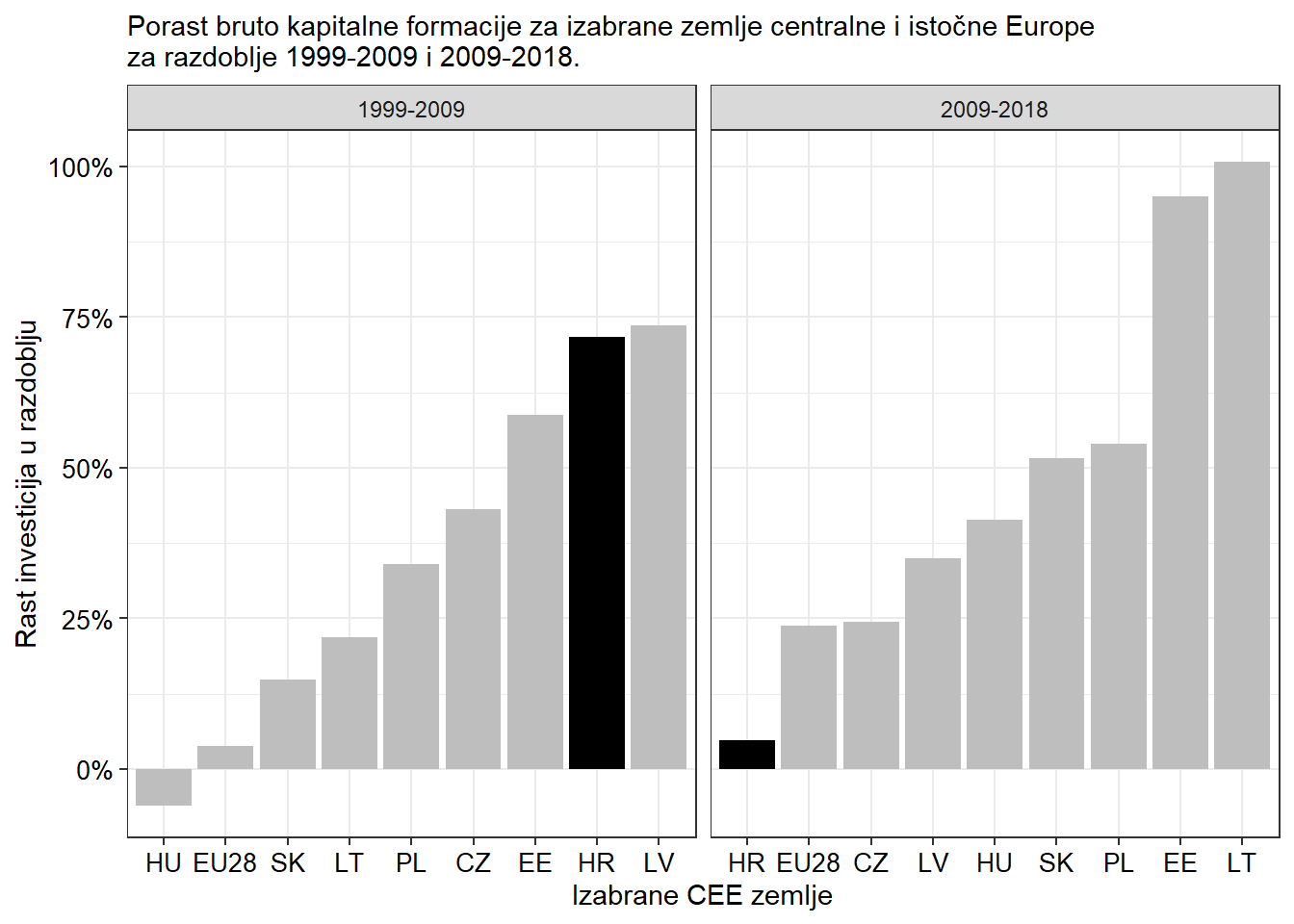 Nakon pregleda agregatnih trendova na domaćem tržištu, dinamiku investicija valja staviti u međunarodni kontekst. Grafikon 2., prikazuje Hrvatsku u komparativnom kontekstu CEE zemalja. Hrvatska je imala najveći rast investicija u pretkriznom razdoblju (oko 75%), ali i najmanji rast investicija nakon Velike Recesije (0.3%). Na grafikonu se vidi preinvestiranost u prvom promatranom razdoblju i podinvestiranost u razdoblju nakon 2009. godine. Ostale zemlje pokazuju uravnoteženiji rast investicija kroz cijelo razdoblje. Primjerice Slovačka u prvom periodu ima rast investicije od 20%, a u drugom rast od 50%. Jasno je stoga da je dinamika investicija u RH znatno drugačije od ostalih CEE zemalja. Važno je i napomenuti da ne postoji jasna korelacija između rasta investicija u razdoblju prije krize (1999‒2009) i pada nakon. Primjerice, Hrvatska i Litva imale su vrlo sličan rast investicija prije krize (oko 74%), ali je rast investicija u Hrvatskoj bio znatno manji od 2009. do 2018. Heterogenosti između zemalja daju naslutiti da je dinamika investicija uvelike određena domaćim ekonomskim faktorima, a ne samo vanjskim šokovima.