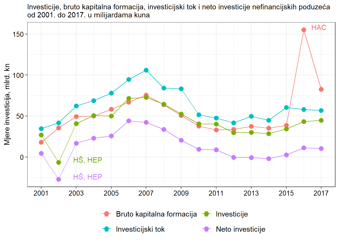Vidljiva su dva outleira. Prvi je u 2002. godini, kada je HEP d.d. imao pad investicija od 21,7 milijardi kuna, a Hrvatske šume od 17,4 milijarde kuna. Ovaj pad investicija nije bio rezultat stvarnog dezinvestiranja nego računovodstvenih preknjižavanja. Drugi je u 2016. godini, kada je HAC zabilježio rast u novu dugotrajnu imovinu u iznosu od 5.7 milijardi kuna. Slika pokazuje znatnu procikličnost investicija (usporediti sa slikom 1). Primjećuje se rast investicija u pretkriznom razdoblju i stalan pad investicijske aktivnosti nakon Velike recesije. Jedina je razlika u tome što neto investicije pokazuju pad vrijednosti već nakon 2006. godine, a ostale mjere investicija pokazuju preokret tek godinu dana kasnije. Promatrajući cijelo razdoblje, poslovni su subjekti najmanje investirali u 2014. godini.