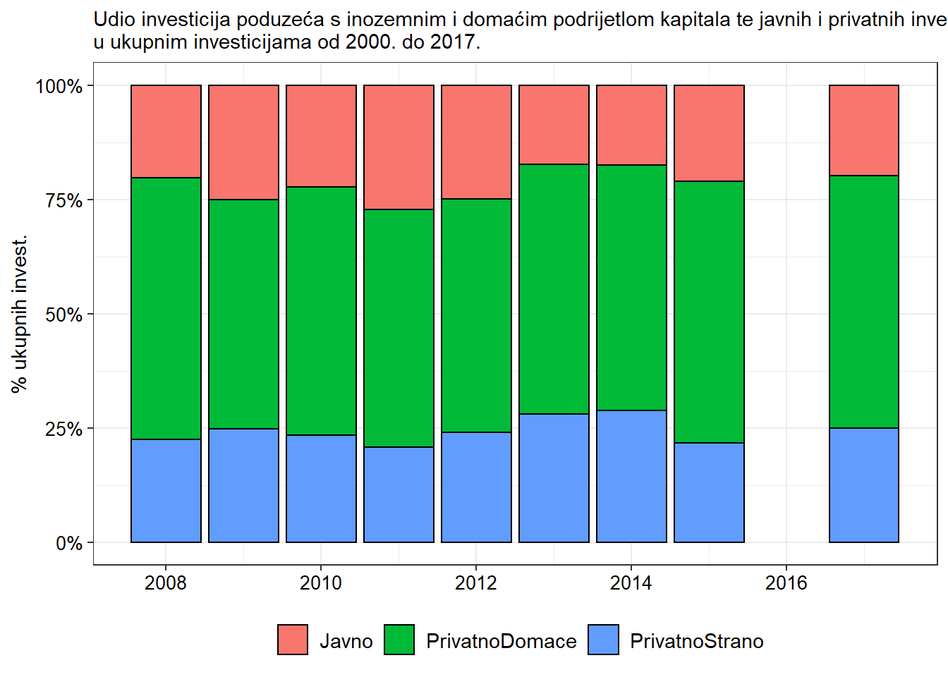 Investicije poslovnih subjekata moguće je strukturirati s obzirom na različite kriterije. Jedan od kriterija su oblik vlasništva (javno/privatno) i podrijetlo kapitala (domaće/strano). Grafikon 4 pokazuje dinamiku investicija s obzirom na oba kriterija. Privatni subjekti podijeljeni su na dvije skupine. U prvoj su skupini poduzeća s natpolovičnim stranim podrijetlom kapitala, a u drugoj poduzeća s natpolovičnim domaćim podrijetlom kapitala. Statistika o podrijetlu kapitala bilježi se tek od 2008. godine pa je i na slici prikazano razdoblje od 2008. do 2017. godine. Iako većinu investicija čine poduzeća s domaćim podrijetlom kapitala, postoji trend rasta udjela investicija poduzeća sa stranim podrijetlom kapitala. Točnije, udio investicija poduzeća sa stranim podrijetlom kapitala raste s 22% 2008. godine na 25% 2017. godine. kada se četvrtinu investicija rade poduzeća sa stranim porijeklom kapitala.