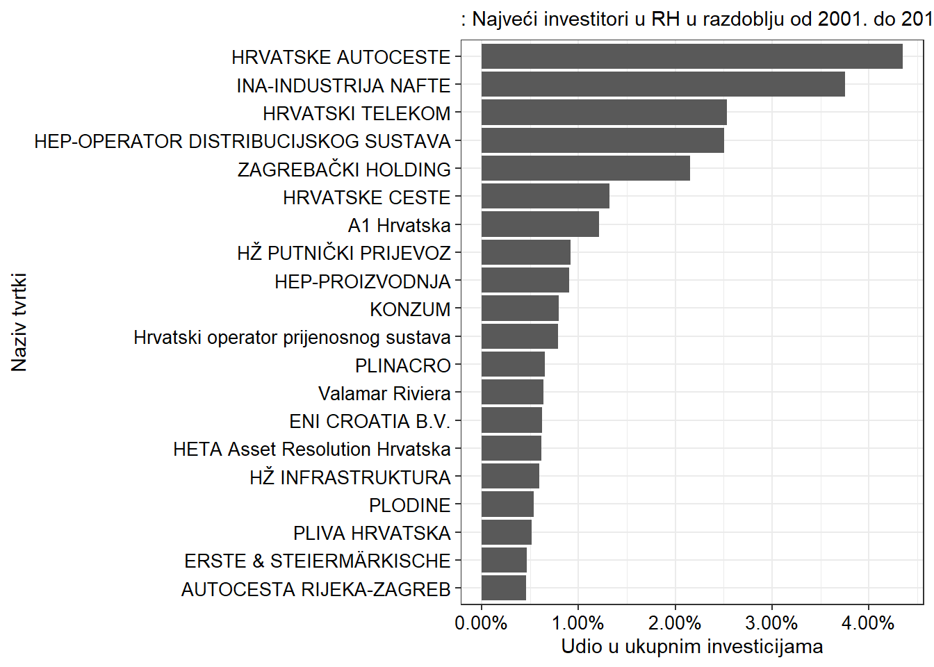 Zbrajajući investicije triju subjekata s najvećim iznosom investicija u promatranu razdoblju, vidi se da one čine 10.63% svih investicija u razdoblju 2001-2017. Investicije velikih poduzeća uvelike određuju agregatne investicije u Republici Hrvatskoj! Zanimljivo je primijetiti da se najveći udio ukupnih investicija na grafikonu odnosi na ulaganje u prometnu infrastrukturu (poduzeća Hrvatske autoceste d.o.o., Hrvatske ceste d.o.o. i Autocesta Zagreb ‒ Rijeka d.o.o.), otprilike 6.13% ukupnih investicija za razdoblje od 2000. do 2017. te da su najveći investitori tri velike tvrtke u državnom vlasništvu. Na proširenoj listi najvećih investitora, 10 od 20 su u većinskom su državnom vlasništvu. Pri tome su poduzeća koja su u promatranu razdoblju privatizirana (poput HT-a d.d.) evidentirana kao privatna.