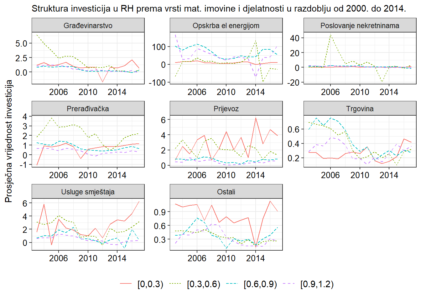 Grafikon pokazuje investicije nefinancijskih poduzeća po industrijama za 4 različite grupe poduzeća. Grupe su diferencirane prema pokazatelju intenziteta zaduženosti u 2008. godini, pri čemu se koeficijent zaduženosti računa kao omjer ukupnih obveza (kratkotrajnih i dugotrajnih) i ukupne imovine. Primjerice oznaka [0,0.3) označuje grupu poduzeća koja je 2008. godine imala vrijednost intenziteta zaduženosti između 0 i 0.3. Kao godina raščlanjivanja izabrana je 2008. godina jer je investicijski kanal financijskih frikcija značajka financijskih kriza. Na svim grafovima prva grupa poduzeća (najmanje zadužena) pokazuje relativno najmanji pad investicija, ali i najbrži oporavak nakon krize. Na svim grafovima je vrijednost investicija niskozaduženih poduzeća u 2017. godini veća od razina investicija u 2008. godini. Najveći rast je zabilježen u sektoru usluga smještaja (turizam).